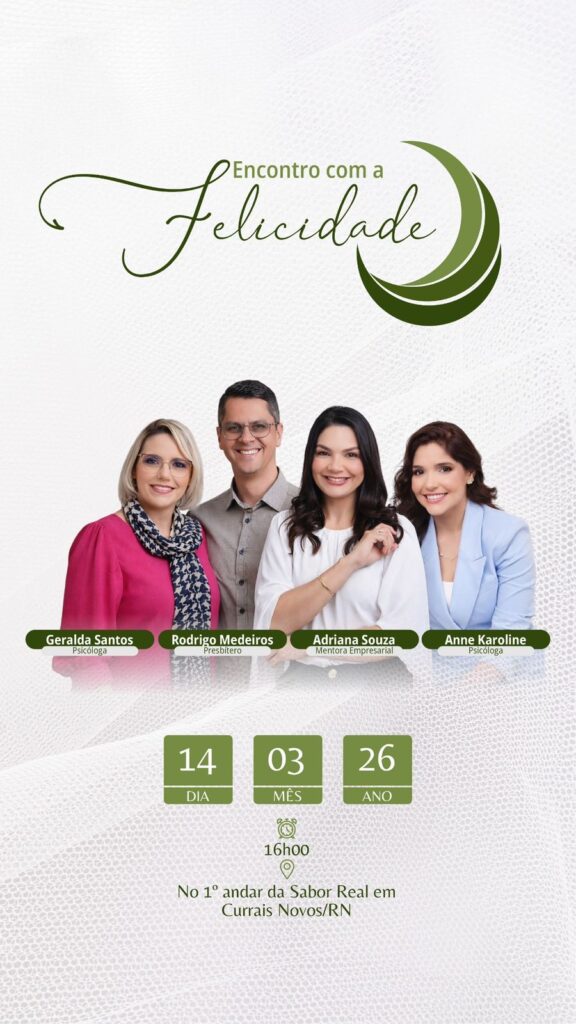 O Encontro com a Felicidade acontecerá na Sabor Real, em Currais Novos/RN, no sábado 14 de março, das 16h às 21h (já contando com o tempo do buffet e networking), reunindo diferentes olhares sobre um mesmo tema: como o nosso estilo de vida, nossas atitudes e decisões impactam diretamente a nossa felicidade.