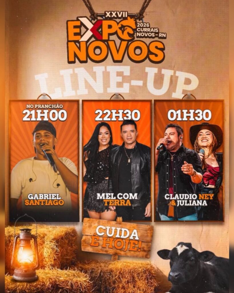 A programação musical deste sábado (19) da ExpoNovos 2026 promete movimentar mais uma noite, no Parque de Exposições José Bezerra de Araújo, em Currais Novos. Sobem ao palco os artistas Gabriel Santiago, Mel com Terra e Claudio Ney & Juliana, atrações confirmadas para animar o público durante a feira.