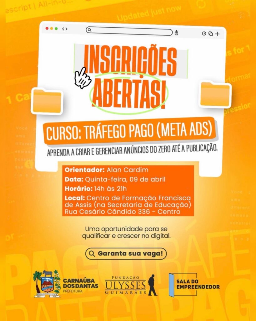 Uma grande oportunidade para quem deseja se qualificar e crescer no mundo digital. A Prefeitura de Carnaúba dos Dantas, em parceria com a Sala do Empreendedor e a Fundação Ulysses Guimarães, abriu inscrições para o curso “Aprendendo como gerenciar o tráfego pago (ADS do Meta) do zero à publicação”. A capacitação será realizada no dia 09 de abril, das 14h às 21h, no Centro de Formação Francisca de Assis, na Secretaria Municipal de Educação.