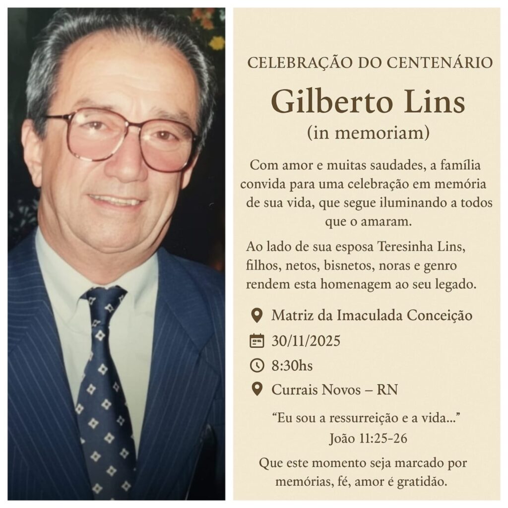 A família de Gilberto Lins realizará, neste domingo (30), uma celebração especial em homenagem ao centenário de seu nascimento. O momento, marcado pela saudade e pelo reconhecimento de sua trajetória, acontecerá às 8h30, na Matriz da Imaculada Conceição, em Currais Novos.