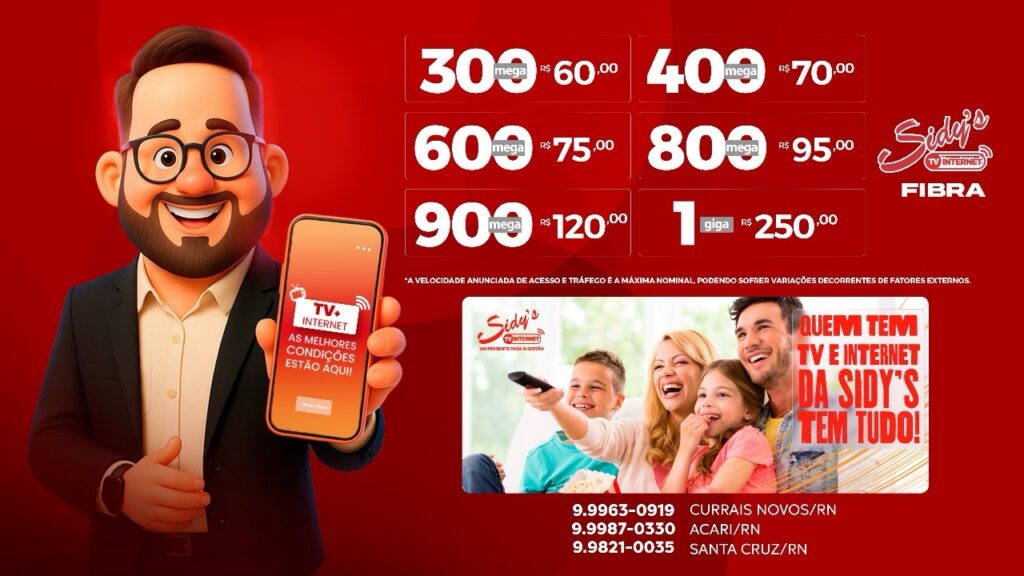 A Sidy’s TV e Internet anunciou uma nova tabela de planos de internet, com velocidades que vão de 300 megas a 1 giga, oferecendo ainda mais opções de conexão rápida e estável para os moradores de Currais Novos, Acari e Santa Cruz.