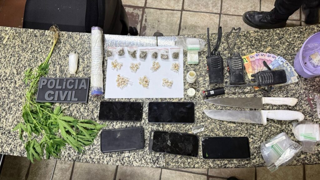 Durante diligências realizadas no interior do imóvel, os policiais apreenderam 82 pedras de substância análoga ao crack, sete papelotes de substância semelhante à maconha, duas mudas da planta Cannabis, três rádios comunicadores, cinco aparelhos celulares, duas facas, duas tesouras, dinheiro em espécie e diversos sacos do tipo ‘zip lock’ utilizados para o acondicionamento de entorpecentes. Na ação, três homens foram presos em flagrante, além da apreensão de dois adolescentes.