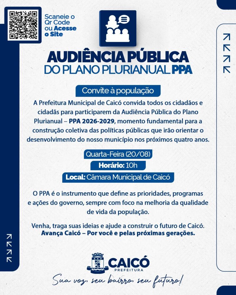 A Prefeitura Municipal de Caicó realizará, nesta quarta-feira (20), a partir das 10 horas, no plenário da Câmara Municipal, a Audiência Pública do Plano Plurianual – PPA 2026-2029.