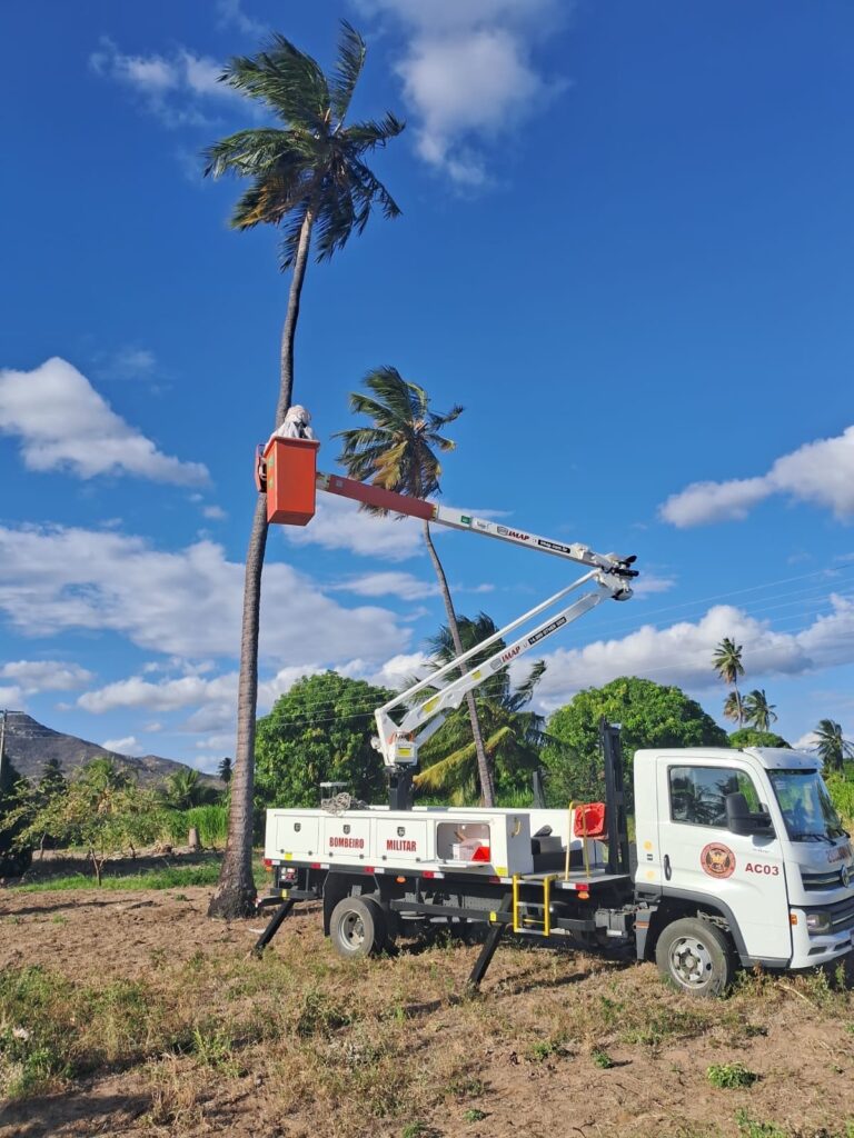 Utilizando o caminhão cesto e técnicas específicas de manejo arbóreo, os militares realizaram o corte controlado das árvores, garantindo a segurança da região. Durante a operação, foi identificado um enxame de abelhas instalado em um dos coqueiros. A guarnição realizou o manejo dos insetos de forma segura, sem causar danos ao meio ambiente, e providenciou o transporte para um local adequado.